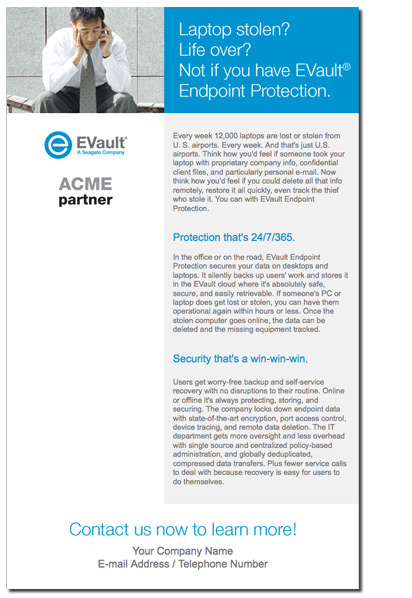 This is an e-mail template available to EVault partners to promote their Endpoint Protection product. I designed and coded this layout. Any additional product screenshots could be added within the white space to the left of the text. |